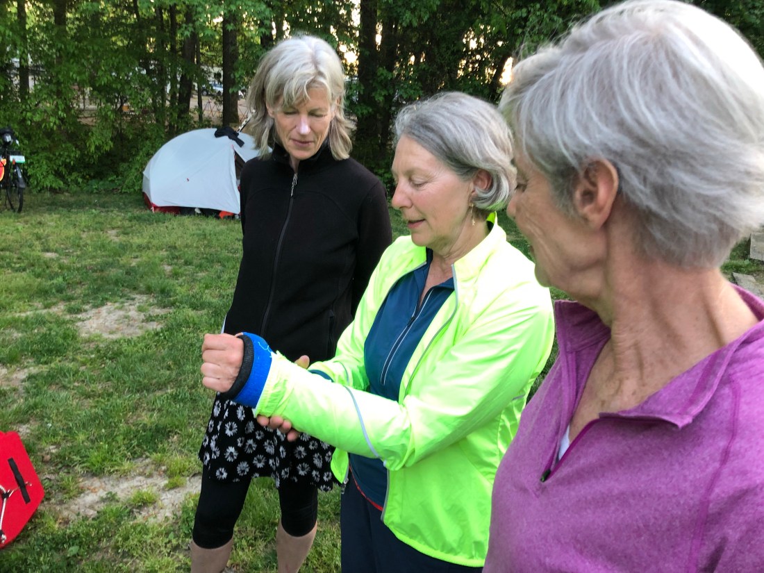 Marie is French Canadian and one of two women on the ride. The day before we were set to depart from Williamsburg she had a freak fall in the parking lot at the motel and broke her wrist! It looked like her ride might end before it began. Instead of leaving with us in the morning she went to see an orthopedist. This evening, at the campground where we landed after two days of riding, Marie rejoined us. Here she is showing off her new cast. We are so glad to have her back with us.