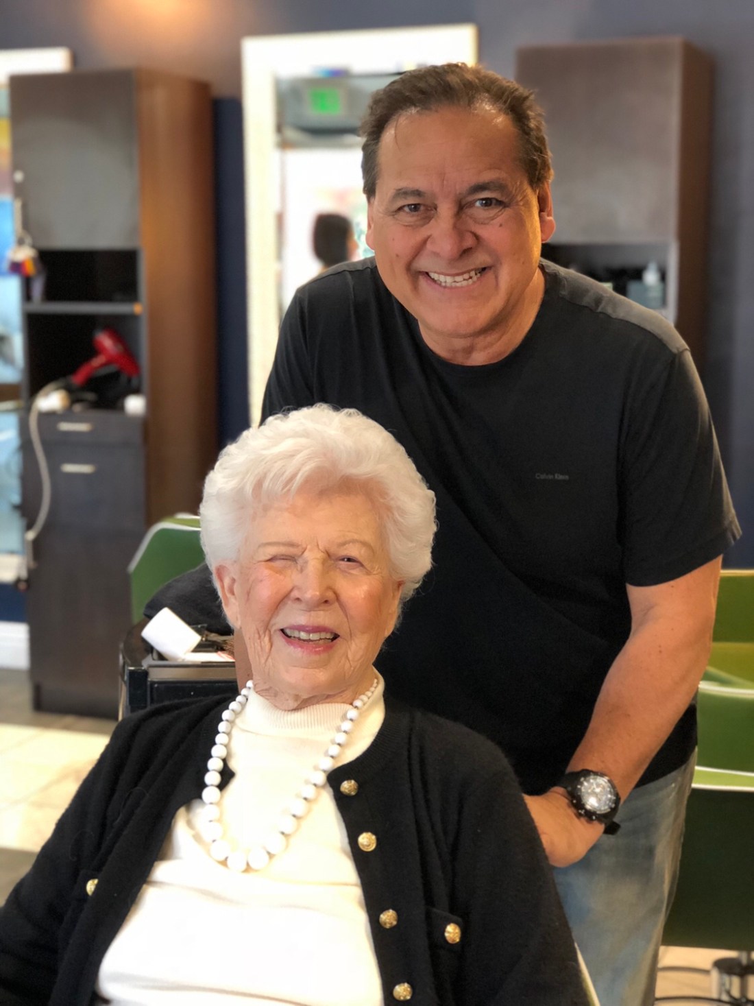 Here is Mom with the man with whom she has her one weekly standing appointment, her hairdresser, Michael.