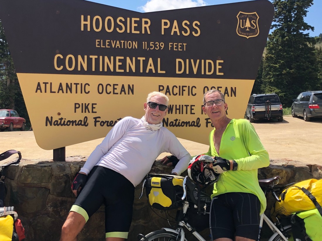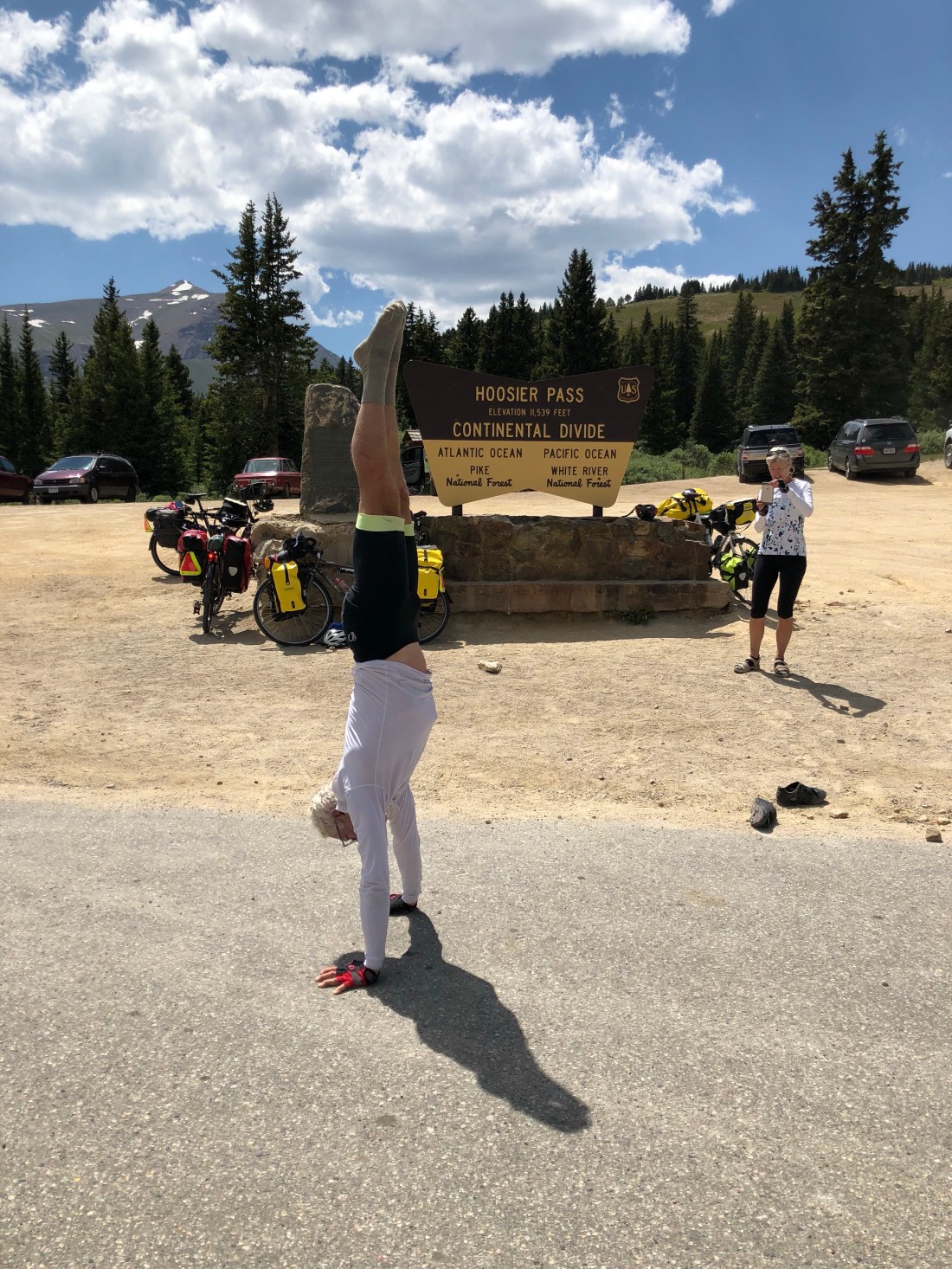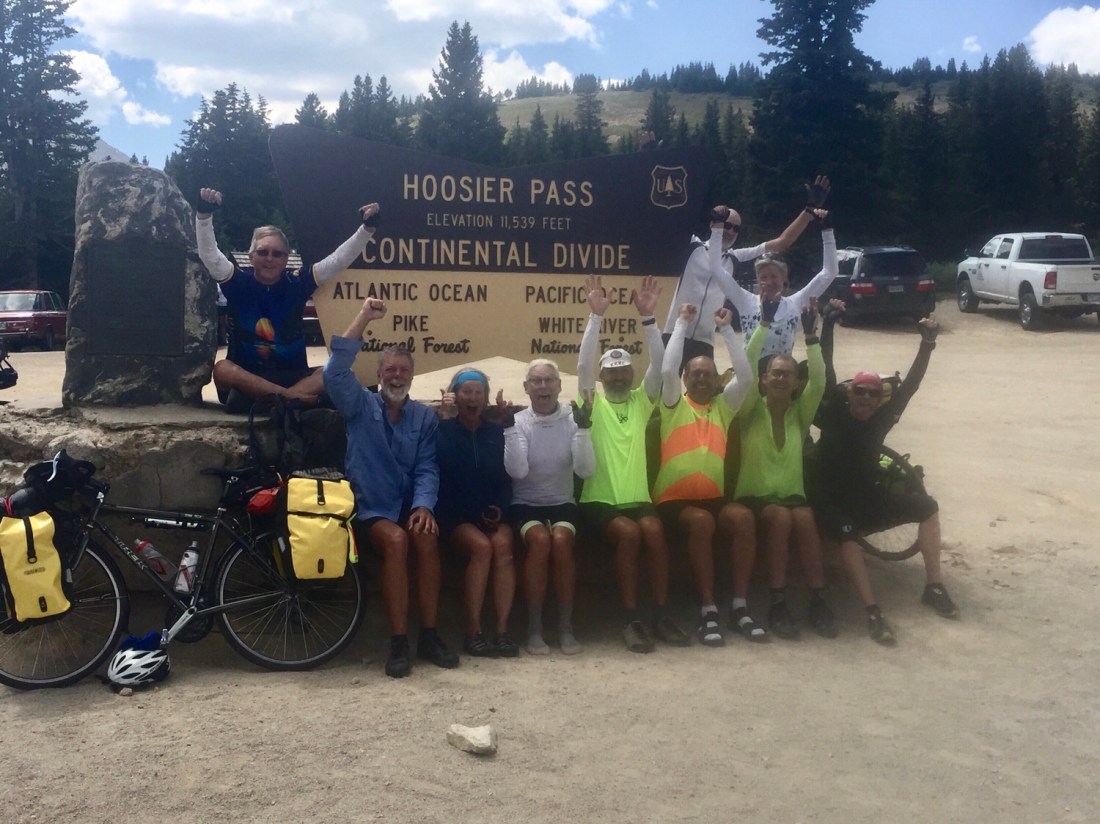 Unfortunately, my sleeping pad/air mattress has been leaking for a couple weeks and three patch jobs have failed to stem the deflation. I’d been getting used to sleeping on hard surfaces but on this night it was our first cold weather and with no pad the cold concrete sucked all the heat right out of me. It wasn’t a good start to a big riding day that called for us to pedal over the Hoosier Pass to the town of Breckenridge. At the top of the pass we converged for a group photo.