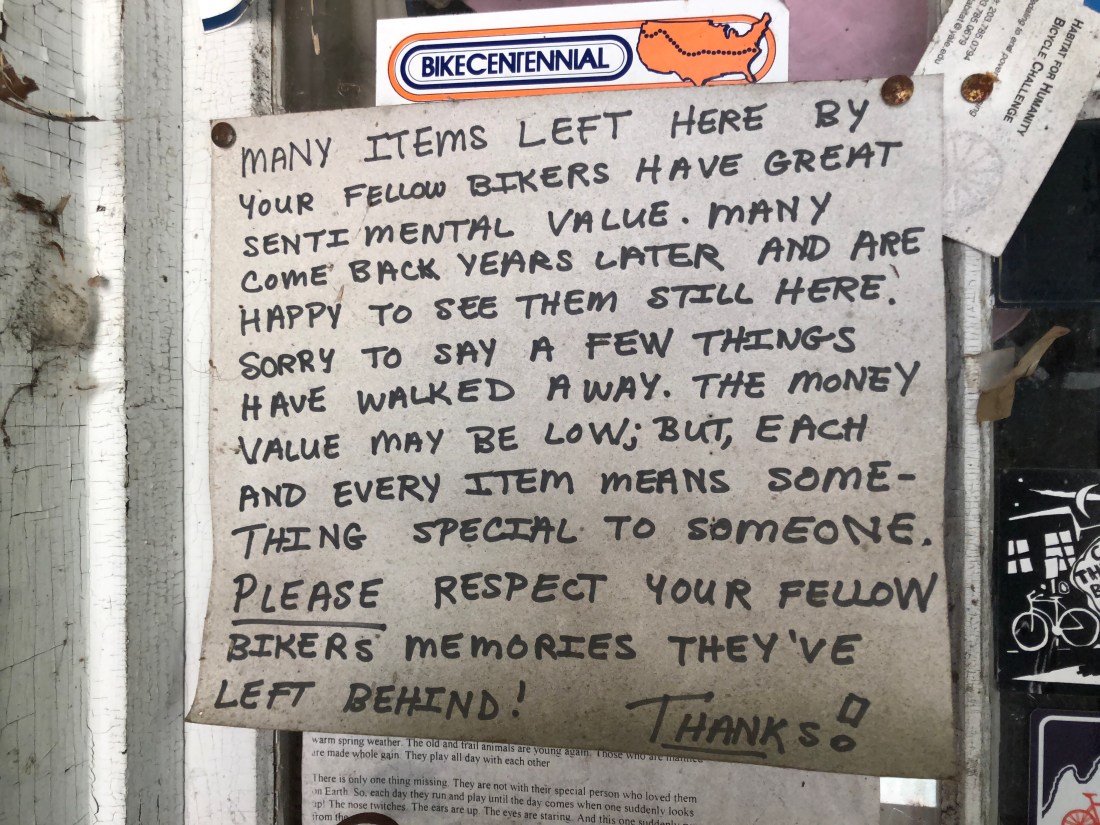 At the Eagles Lodge in Chester we met these two intrepid twenty-something’s, Jenny and Lynn, doing the Transam on bikes outfitted with cat-litter-container panniers. The next morning it didn’t take long before they “chicked” us on the first hill. Our strongest rider, Tom, tried to “unchick” them to no avail. They had passed us after starting eleven days after us!