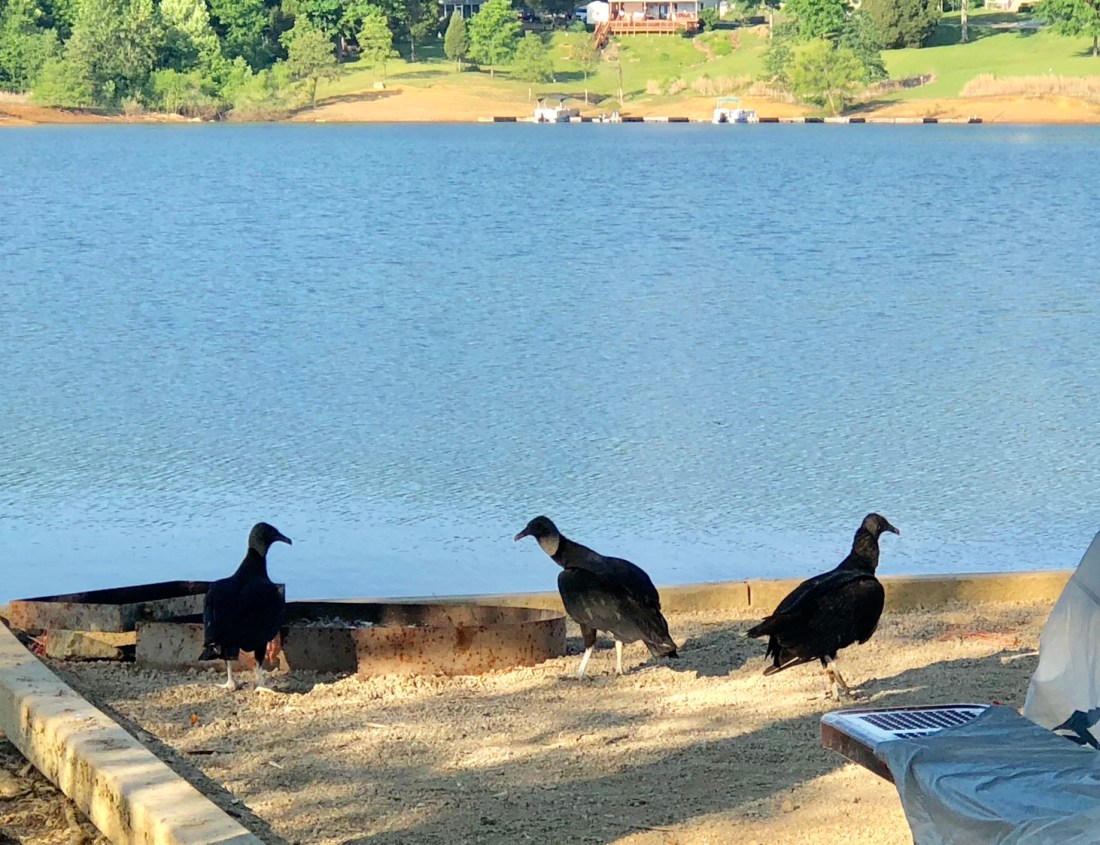 These buzzards were hanging out in the adjoining campsite one morning waiting for the sun to heat things up and create some “thermals” to ride aloft to start their daily search for fresh overnight road-kill. And there is plenty to keep these clean-up crews busy!