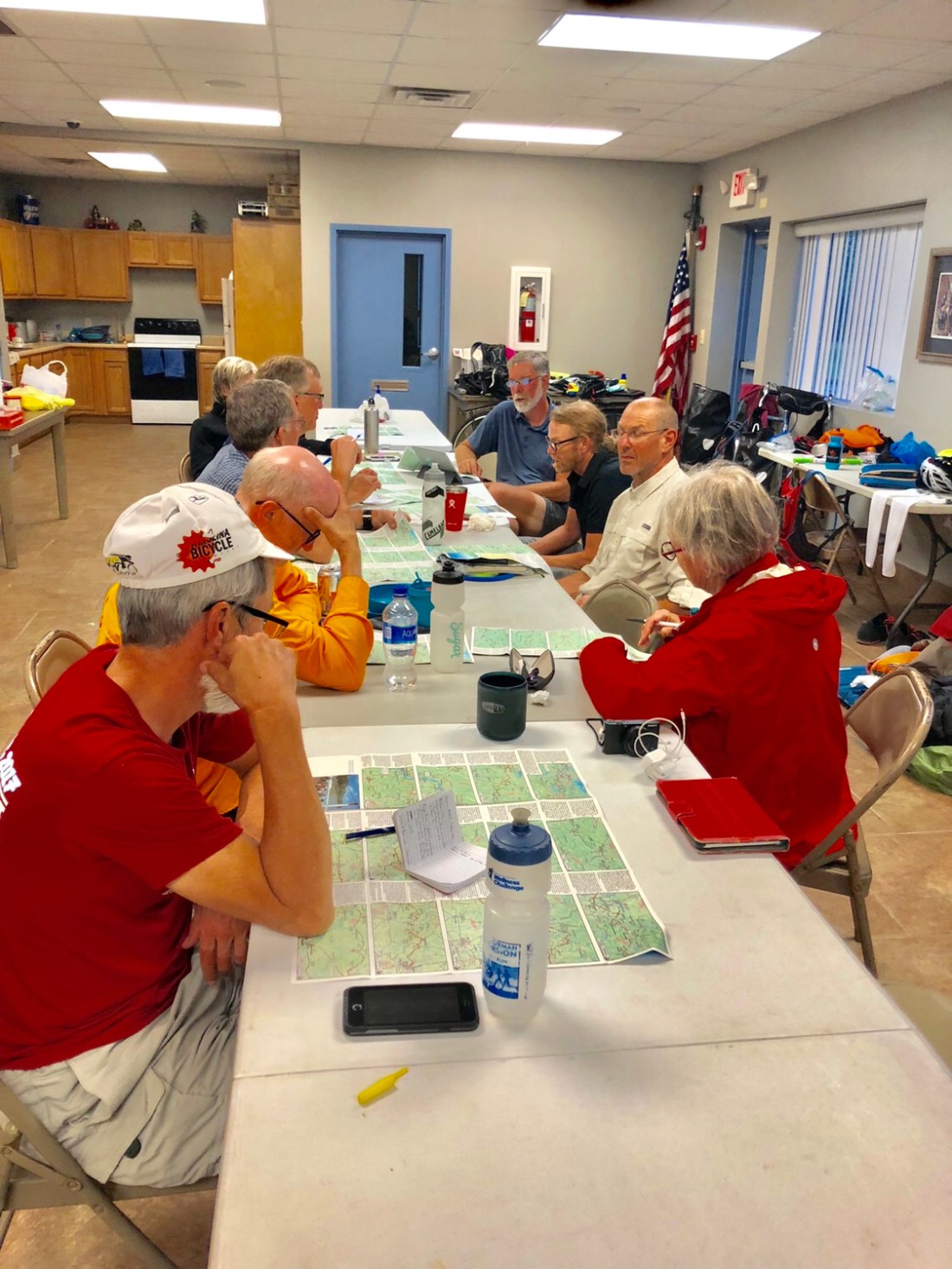 At our daily evening map meetings like this one at the Volunteer Fire Department where we stayed in Utica, Kentucky, we discuss the route for the next day. Cook assignments are also announced along with our destination and the venue where we will be staying. We have stayed at lots of churches where we can have access to a kitchen and sleep indoors, a welcome luxury.