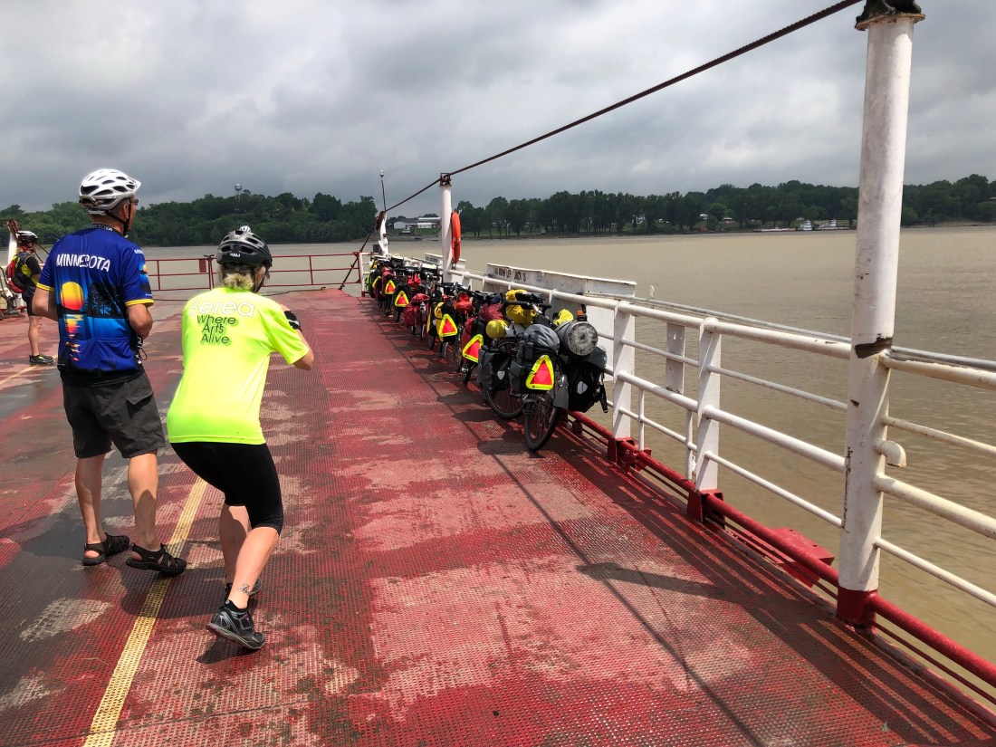 Here are our bikes lined up on the ferry to cross the Ohio River into Illinois after a rain delayed start from Marion, Kentucky.
