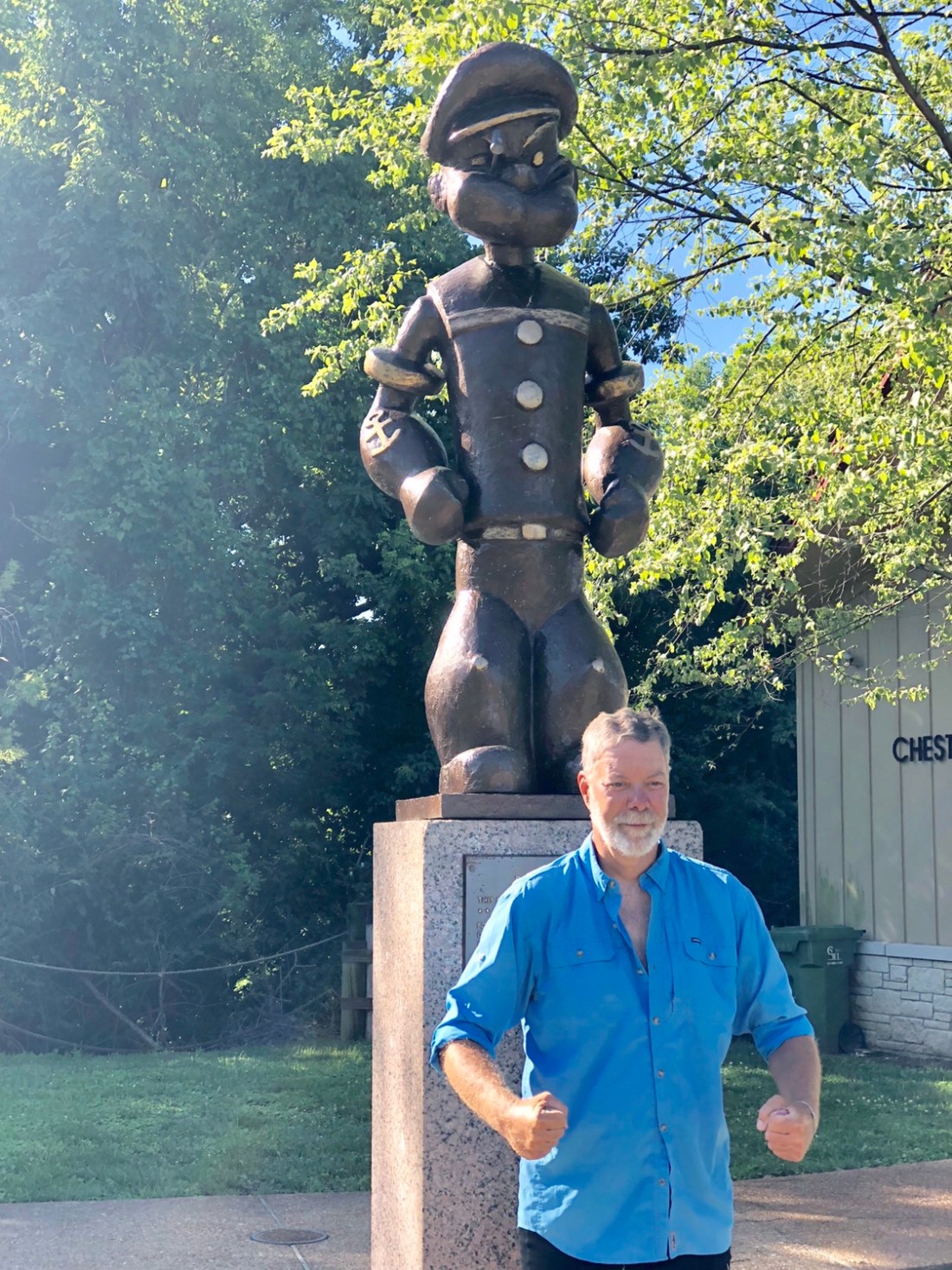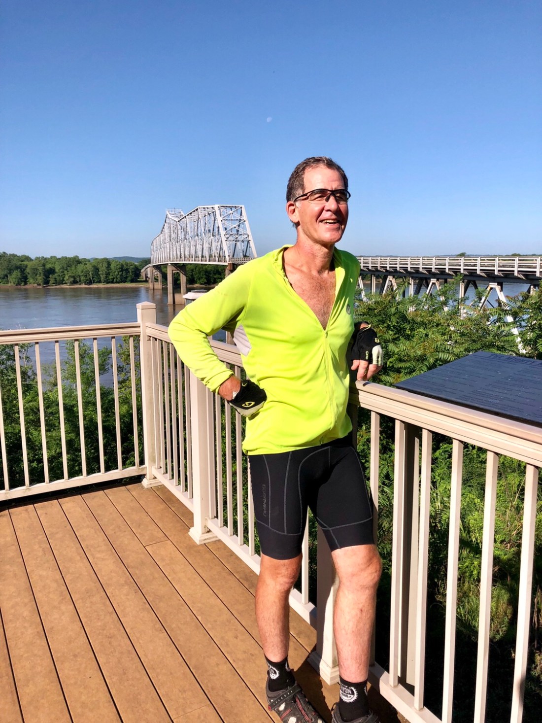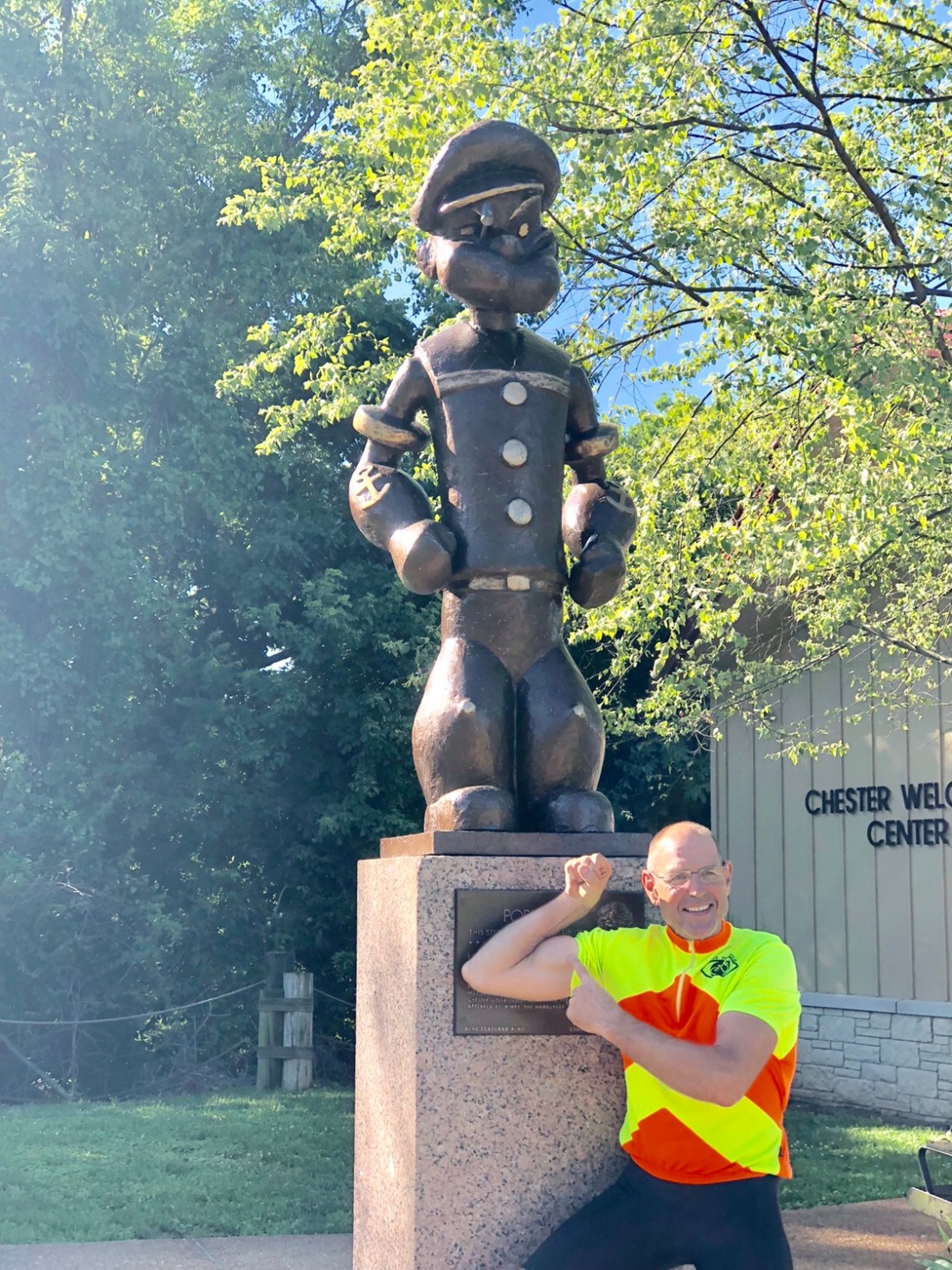 Bob and Wally both pose with the town’s bronze statue of Popeye. Wally is our ride leader and also happens to be the President of the board for Adventure Cycling Association. Doctor Chuck is shown with the bridge behind him.